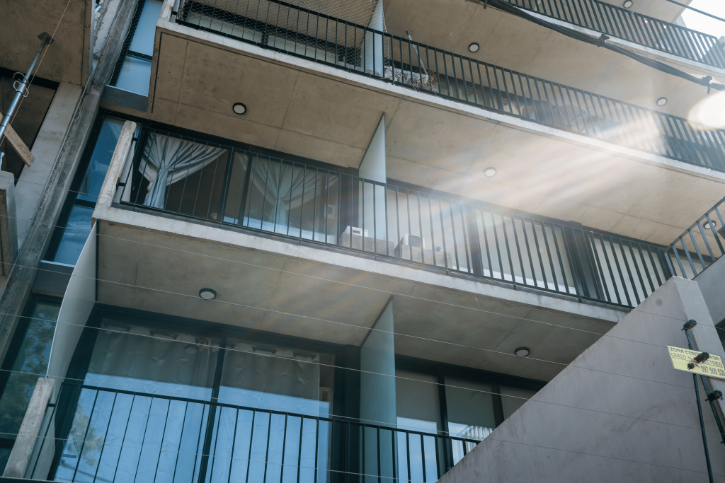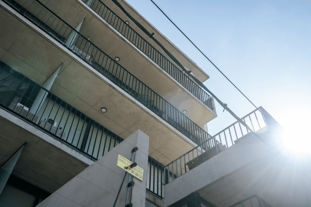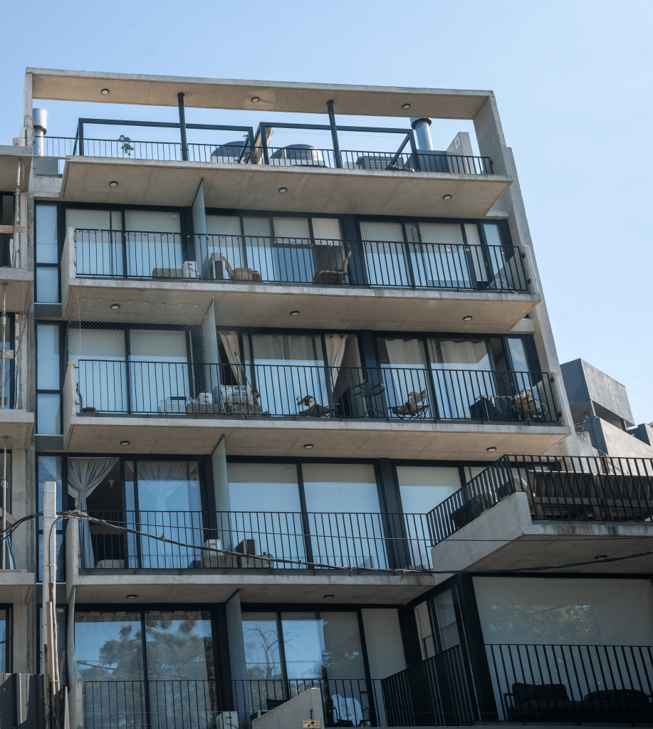 Su arquitectura combina hormigón visto, parasoles de aluminio y aberturas de alta prestación, materiales que aportan una estética contemporánea y aseguran eficiencia, durabilidad y bajo mantenimiento.